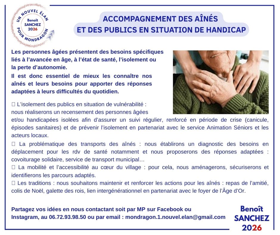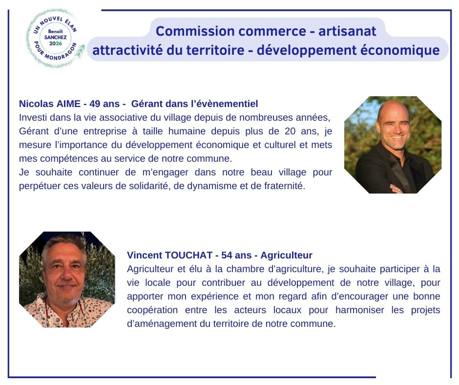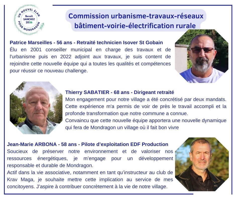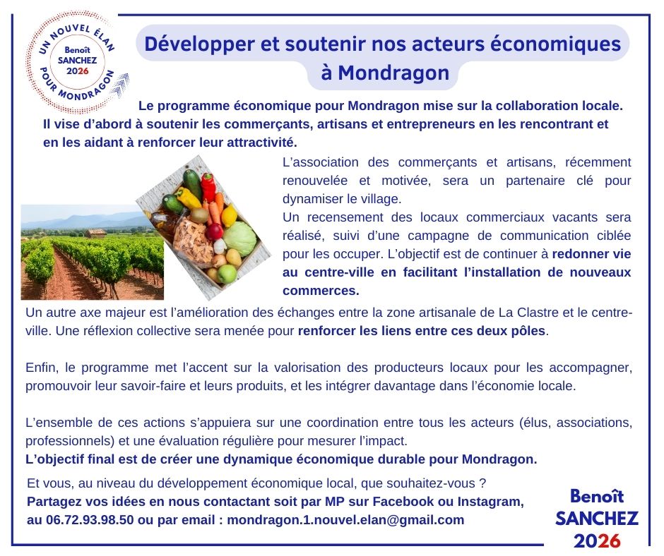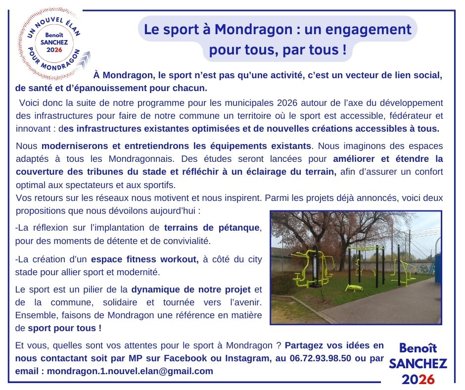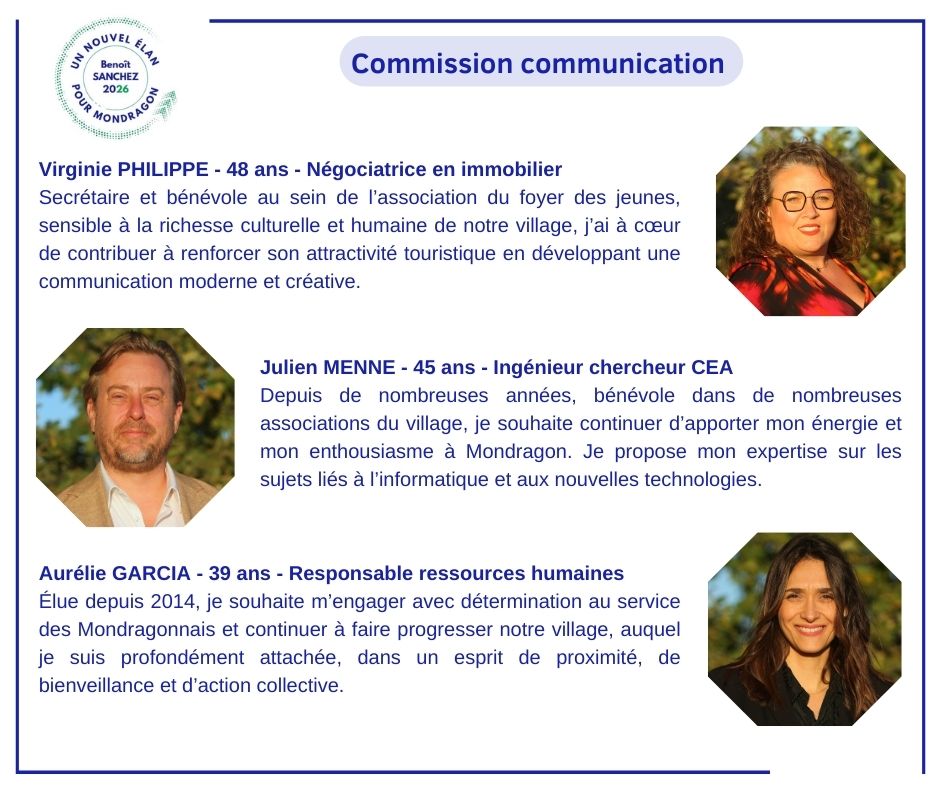Autour de Benoît SANCHEZ, une équipe sans étiquette politique, motivée et représentative du tissu local s’est constituée : des femmes et des hommes investis dans la vie associative, économique et sociale de Mondragon, porteurs d’une même volonté d’avancer ensemble. Elle réunit 50 % d’élus de la majorité sortante et 50 % de nouveaux visages aux profils variés, avec des valeurs de respect, de proximité et d’engagement.